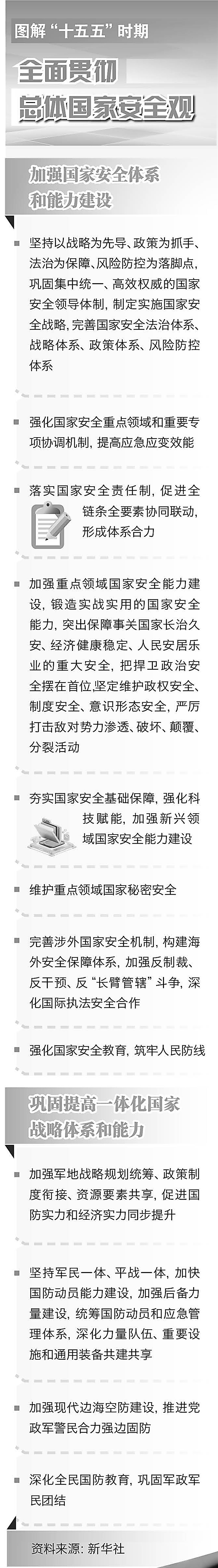 第一,在必须遵循的原则方面,新增“坚持统筹发展和安全”这一重大原则。第二,在主要目标方面,首次将“国家安全屏障更加巩固”作为独立目标明确提出。第三,在加强国家安全体系和能力建设方面,首次将“完善涉外国家安全机制,构建海外安全保障体系,加强反制裁、反干预、反‘长臂管辖’斗争”写入五年规划纲要。第四,在保障国家经济安全方面,首次将“提升网络安全保障能力”单列一节。第五,在维护公共安全方面,突出强调了“公共安全治理”理念。第六,在维护社会稳定和安全方面,首次明确“加强新经济组织、新社会组织、新就业群体党的建设”,并将这一部署作为提升新兴领域治理效能的关键抓手。第七,在国防和军队现代化建设方面,首次将“加快先进战斗力建设”作为独立任务明确提出。