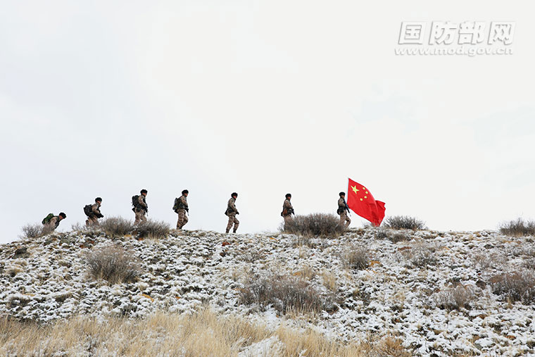 新疆阿勒泰军分区某边防连官兵在边关执行巡逻任务