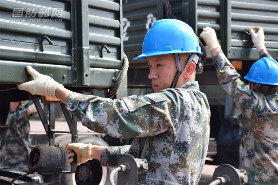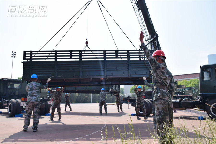 汽修兵正在进行快速更换后车厢板总成比武训练。