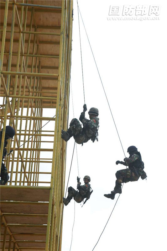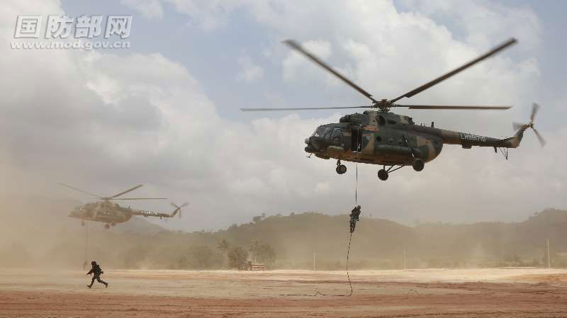 第四张照片:中柬双方队员进行直升机机降训练。