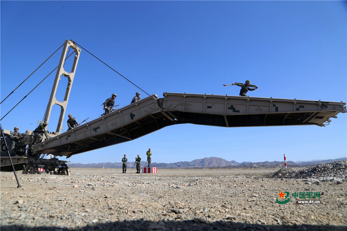 在此次“架桥车组比赛”中,三支参赛队员要在规定行车路线内,安全行驶至指定架桥区域完成架设任务。一路上,随机爆炸的“炸点”会带给参赛队员视觉上的干扰和心理上的考验。尤其是在烈日的炙烤下,还要进行大工程、持久性架桥任务,这就更加考验他们的体力、耐力和技术能力。但三支参赛队员都没有被这些困难所影响,他们以惊人的速度、娴熟的技巧、相互追赶、激烈角逐,带给了观众朋友们无与伦比的视觉盛宴。