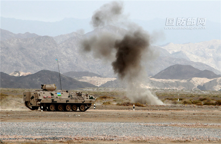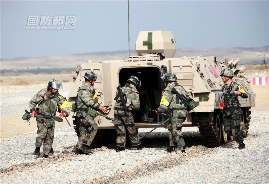 比赛当天,代表中国出赛的南部战区陆军某旅工兵分队首先出场。随后出场的俄罗斯、乌兹别克斯坦工兵分队也进行了直行限制路、桩间转弯、浅滩、步坦混合雷场等障碍克服作业。最终,经项目裁判组判定,中国工兵分队取得工兵班组单项赛第一。