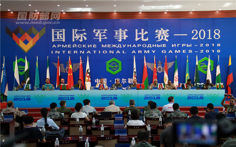 7月28日上午,陆军在新疆库尔勒就承办“国际军事比赛-2018”,召开各参赛国代表团指挥官记者见面会,中国、白俄罗斯、埃及、伊朗、哈萨克斯坦、巴基斯坦、俄罗斯、乌兹别克斯坦、委内瑞拉、津巴布韦等10国指挥官向中外媒体介绍本国参赛队赛前准备情况,6种语言现场同声翻译。
