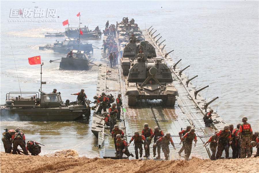 中国参赛队连级门桥渡送重型装备。靠岸后,重型装备正在启动上岸。李刚 摄