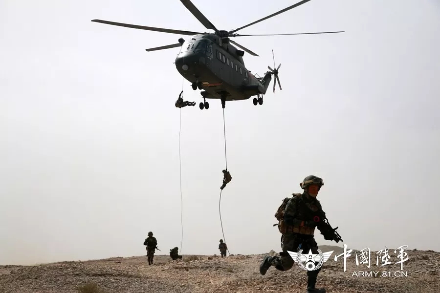 “这是由以前‘演’为主向现在‘战’为先的转变。”在瞿旅长引导下,记者通过战场电视系统看到,在距“恐怖分子”营地一侧数公里外地域,某型运输机打开机舱。指挥员一声令下,数名特战队员依次跃出机舱门,迅速成战斗队形向前运动。紧接着,在“恐怖分子”营地另一侧数公里处,数名特战队员也搭乘运输直升机飞临预定地域。