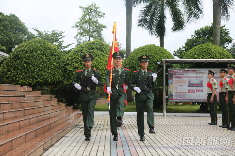 武警雪豹突击队举行宣布士兵退役命令暨向武警部队旗告别仪式,图为迎武警部队旗。