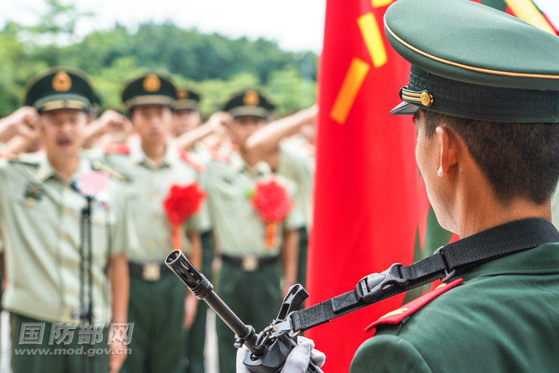 武警雪豹突击队举行宣布士兵退役命令暨向武警部队旗告别仪式,图为老兵宣誓。