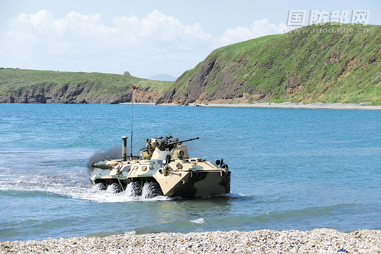 8月18日,在“海上登陆”项目接力赛的训练中,我参赛队员驾驶装甲车快速上岸。肖勇利 摄