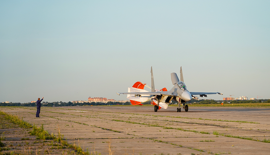 8月13日,参赛的中国空军歼-16战斗机降落在俄罗斯佳吉列沃机场。 新华社发 许毅 摄