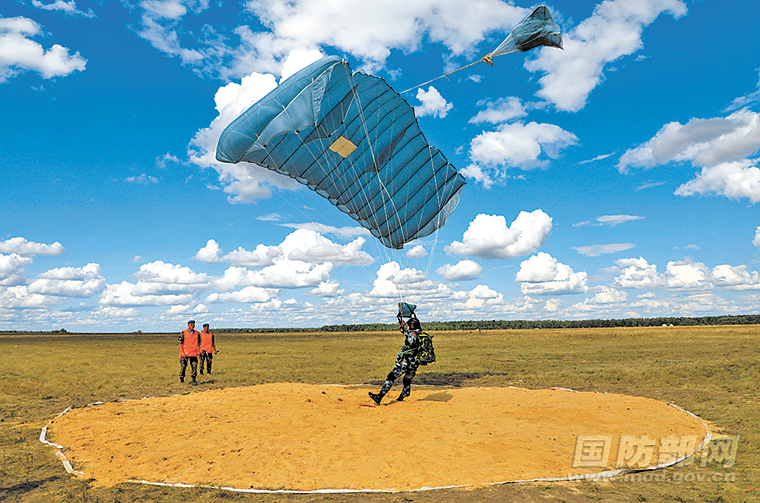 在“空降排”项目的定点跳伞课目比赛中,中国队队员成功踩点。 解放军报特约通讯员 方超 摄