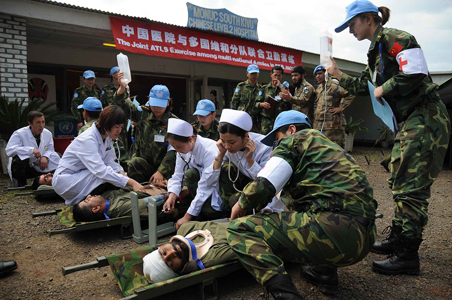 中国第九批赴刚果(金)维和医疗分队与任务区内多国维和友军成功举行了联合卫勤保障救治演练
