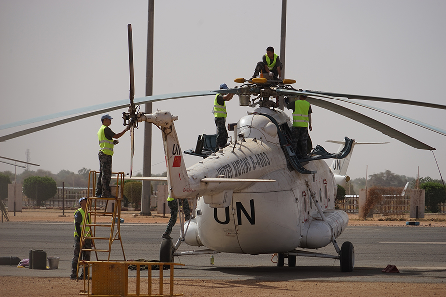 赴苏丹达尔富尔直升机分队机务官兵对直升机进行维护。