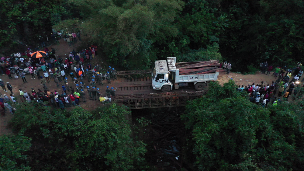 中国赴刚果(金)工兵分队修复被毁桥梁后车辆试载通行。