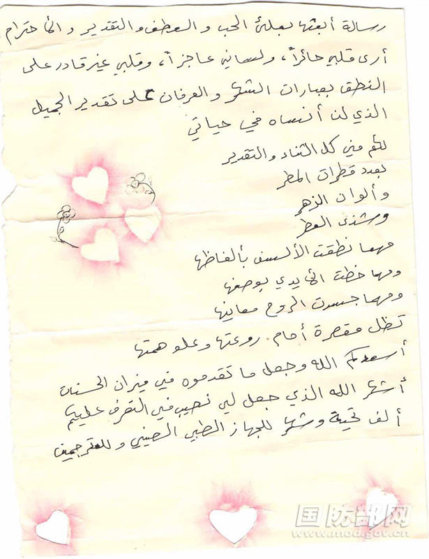 写信人名叫穆罕默德,是一位生活在黎巴嫩的叙利亚难民。数周前,他意外被狼咬,导致左腿严重受伤,焦急无助的他经人介绍来到中国维和部队医院就医。经过中国军医热心细致的救助,他的身体逐渐康复。为了感谢中国维和人员,他写下了这封信,信的大意是:“我愿将世上所有的颂赞和感激送给你们,像密如织线的细雨、像姹紫嫣红的鲜花、像馥郁芬芳的香味。无论什么语言、无论什么文字、无论怎么展现他们的涵义,在你们为我所做的崇高和伟大的一切面前,都显得微不足道……谨向中国维和医疗队和语言助理致以万分感谢和美好祝福!”