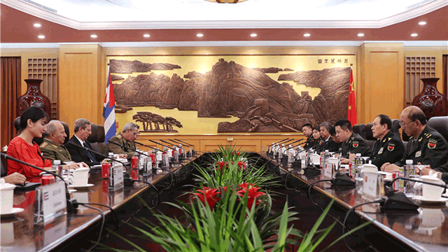 2018-11-23 18:56国务委员兼国防部长魏凤和11月23日下午在京与古巴革命武装力量部部长莱奥波尔多·辛特拉举行会谈。魏凤和会见埃及武装部队参谋长