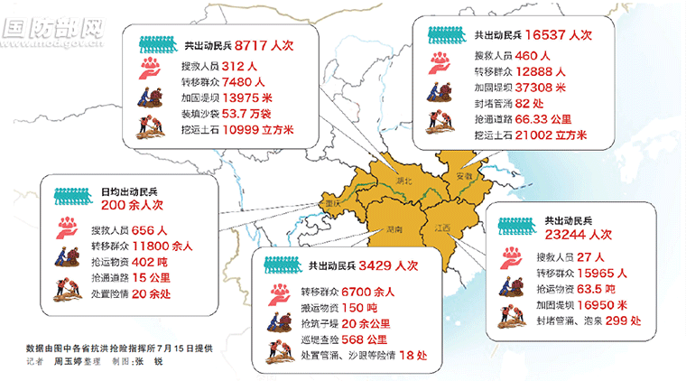 数据由图中各省抗洪抢险指挥所7月15日提供 记者周玉婷整理 制图:张 锐