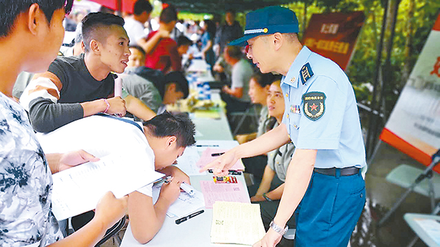 2018-06-11 09:40招聘会上,征兵宣传人员指导学生现场报名应征。物流军民融合补齐哪些短板