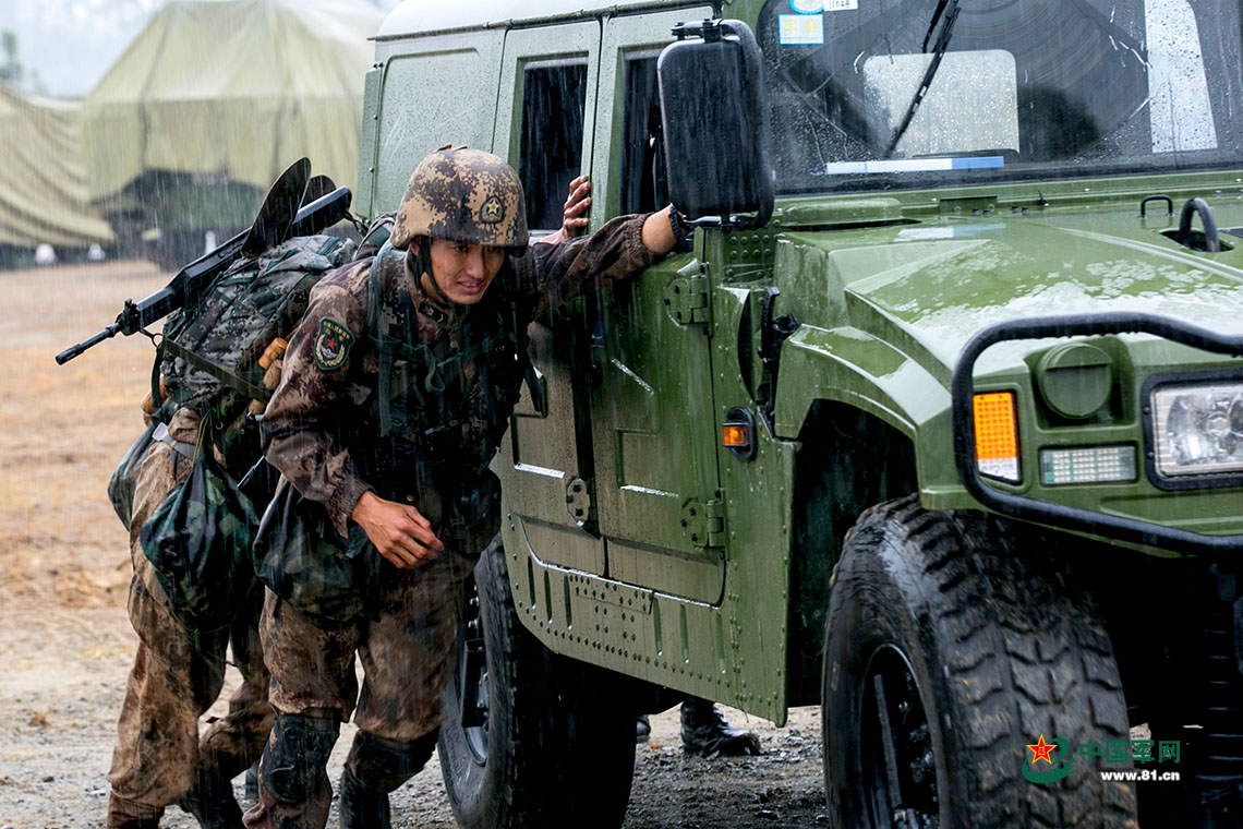 暴雨如注,寒风刺骨,官兵训练热情却丝毫没有下降。协同攀登、车辆抢救、战场救护等课目轮番上演,不少官兵全身湿透,身上冒起腾腾热气。