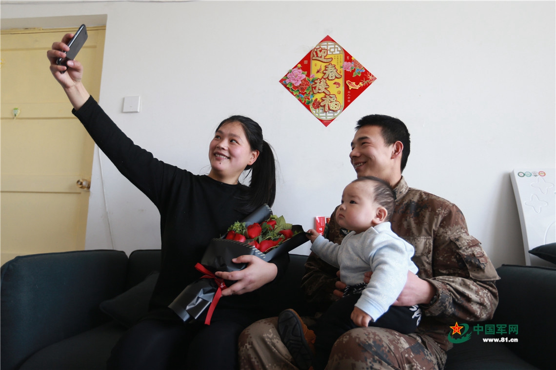 春节,陆军第76集团军某旅作战支援营警卫勤务连上士刘英涛妻子从江西老家赶往部队过节,虽然不太适应高原气候,但一家人能幸福地在一起过年,心里也是乐滋滋的。