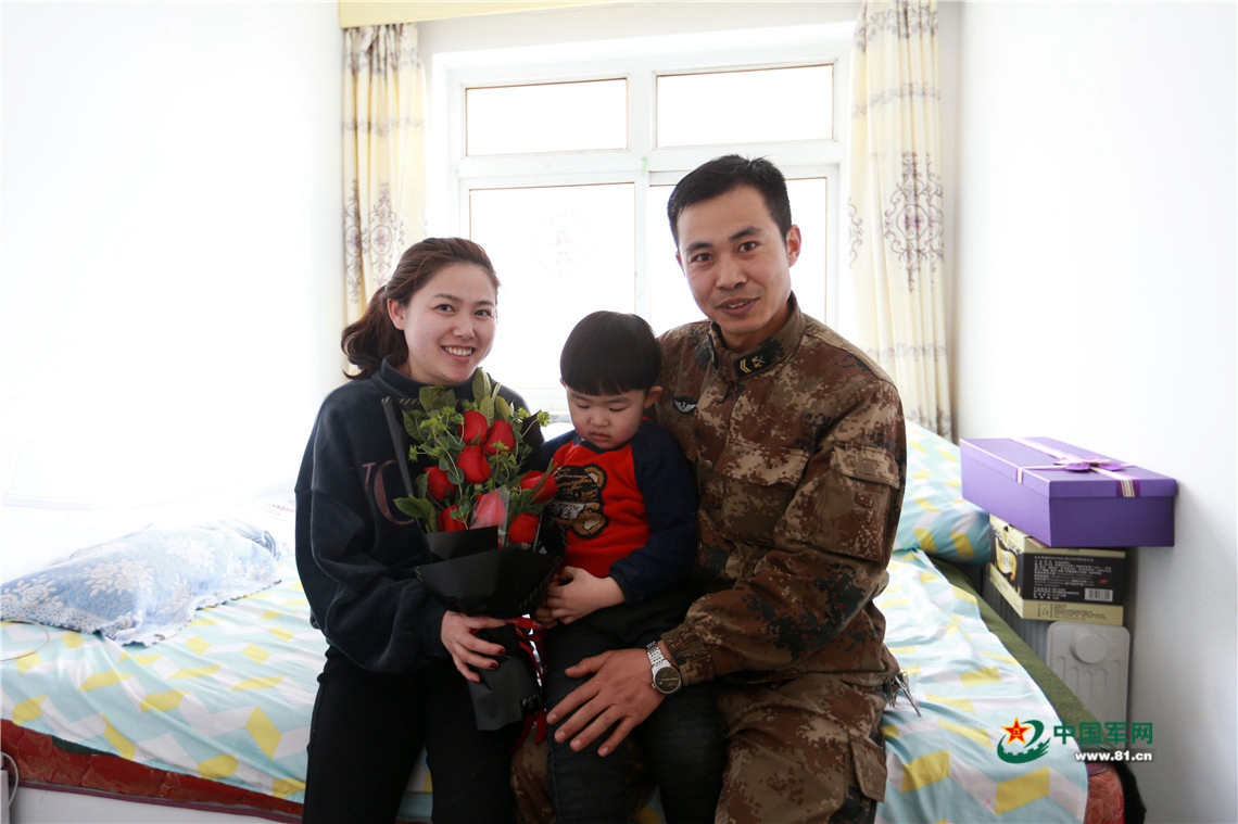 春节,陆军第76集团军某旅作战支援营警卫勤务连四级军士长王鸿斌幸福的一家。