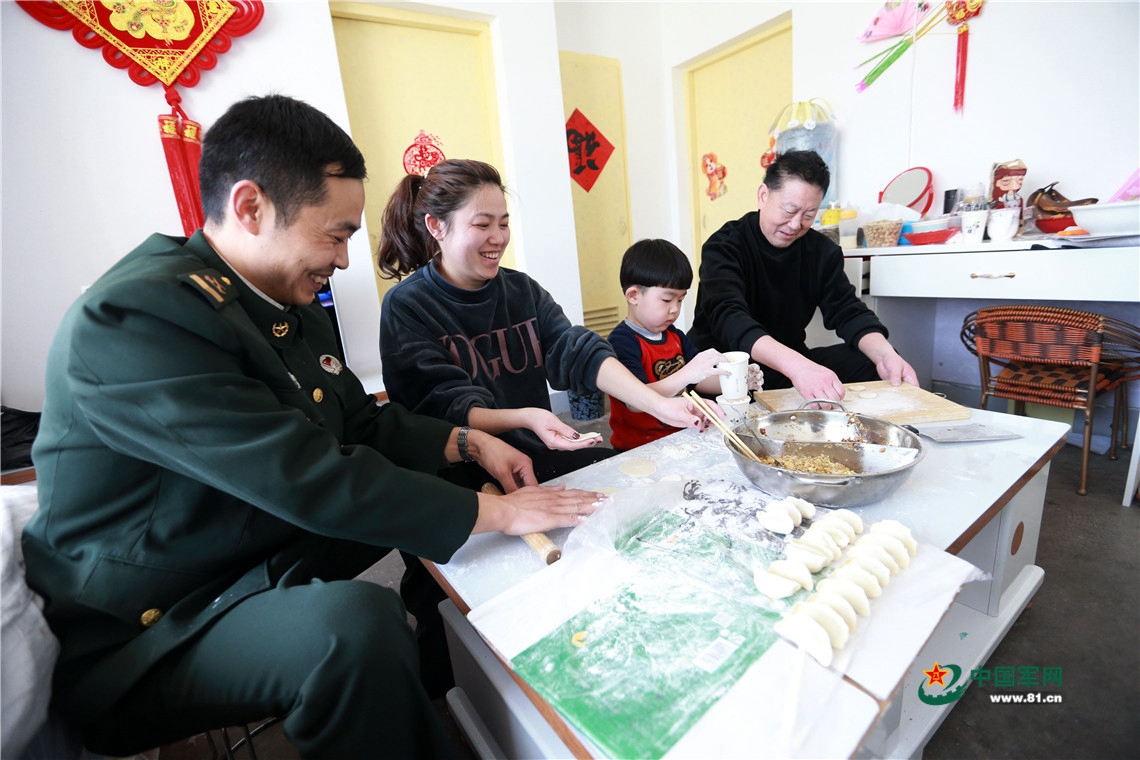 春节,陆军第76集团军某旅作战支援营警卫勤务连四级军士长王鸿斌与妻子孩子还有岳父一起包饺子准备年夜饭,其乐融融。