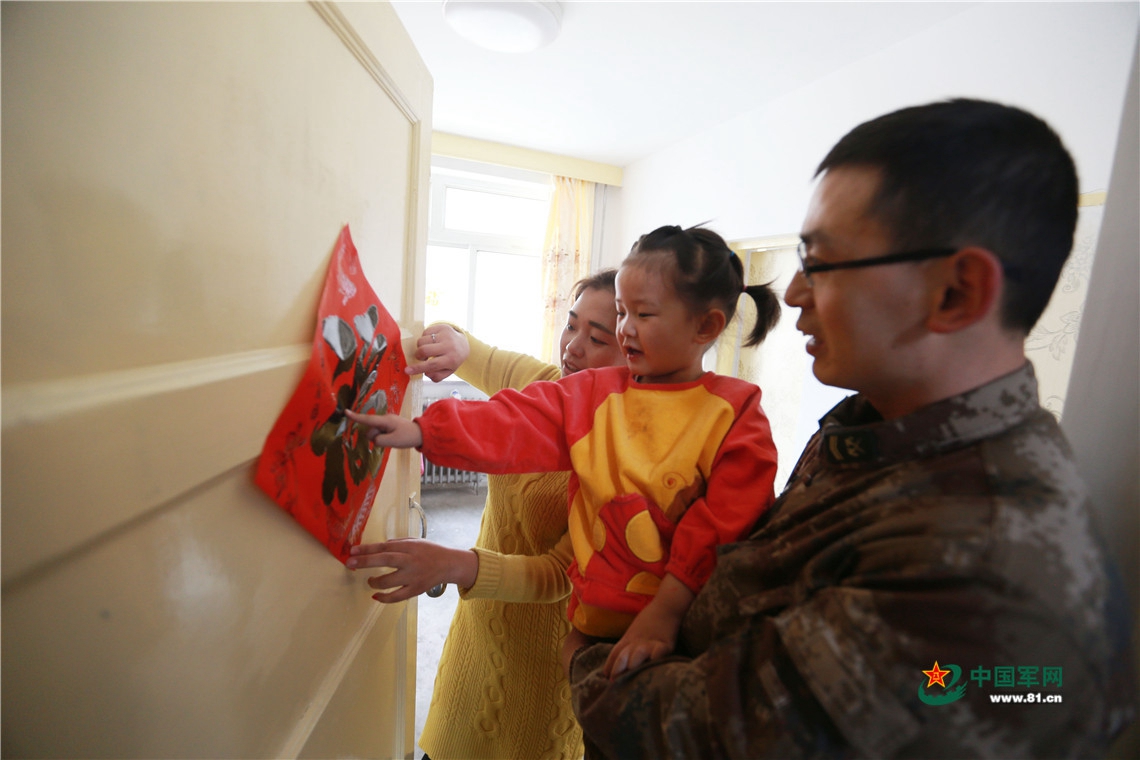 春节,陆军第76集团军某旅作战支援营警卫勤务连上士段小燕和妻子小孩一起贴对联、福字,营造过年氛围。