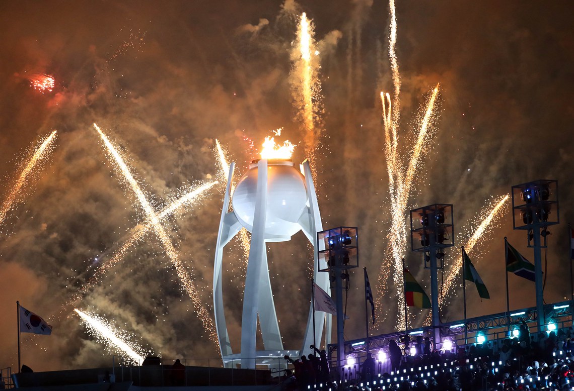 2月25日,平昌冬奥会闭幕式上的烟花表演。 新华社记者李钢 摄