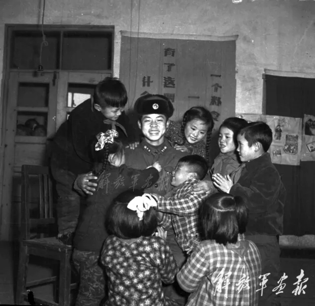 雷锋和建设街小学的孩子们亲密合影。