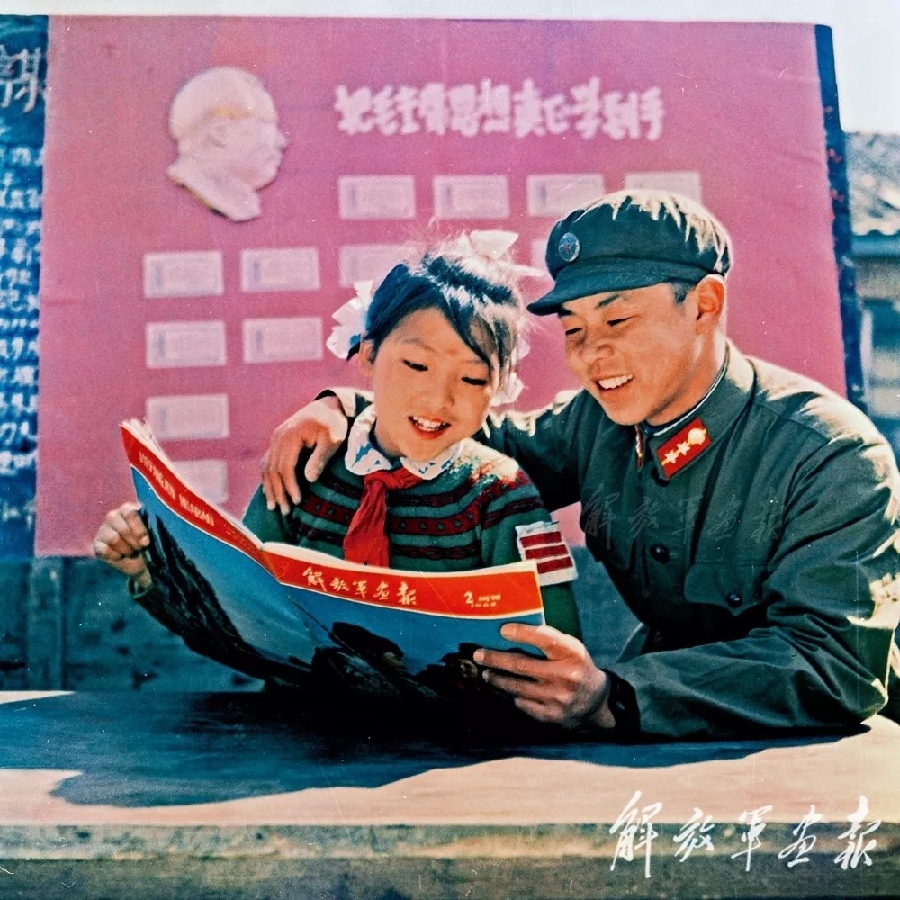 1962年,雷锋和本溪路小学五好学生陈雅娟在阅读《解放军画报》。