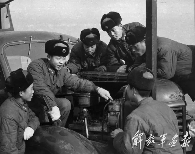 雷锋同志和战友们交流保养车辆和节约油料的经验。