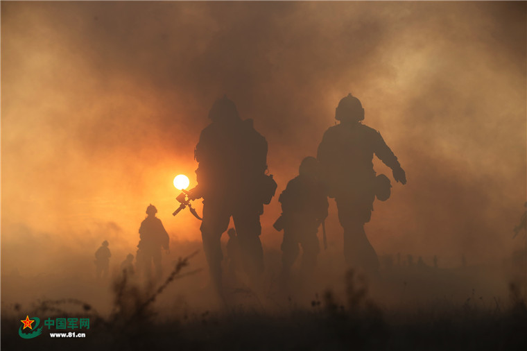 “跨越-2017·朱日和”基地化训练中,凌晨发起的攻击,硝烟战火中,冲锋的战士勇敢无畏。仇成梁 摄