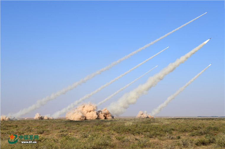 “火力-2017·青铜峡”基地化训练中,红军参演炮兵部队——第71集团军某炮兵旅远程火箭炮进行昼间实弹射击。彭希 摄