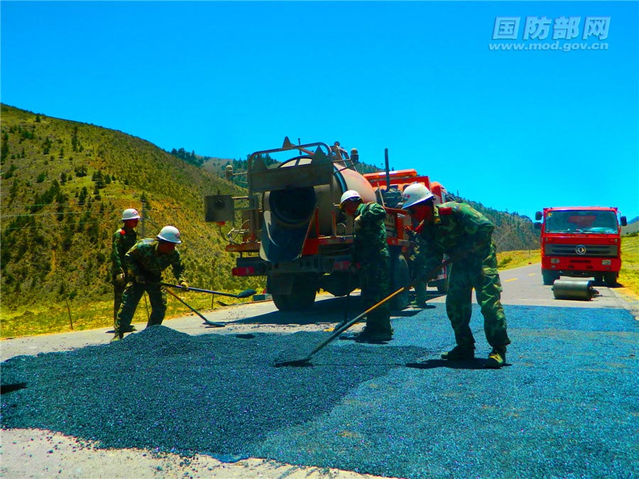 官兵在川藏线修补坑洼路面。