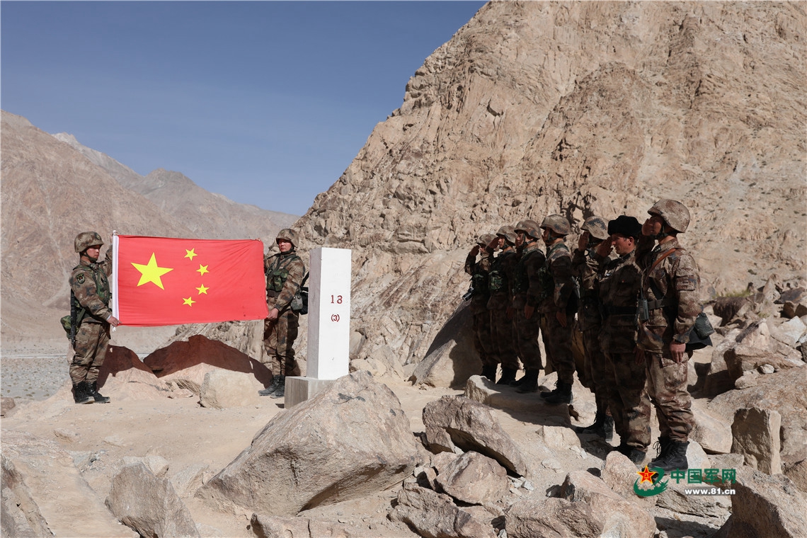 指导员给新战士讲述守防故事,并组织新兵向国旗界碑敬礼。