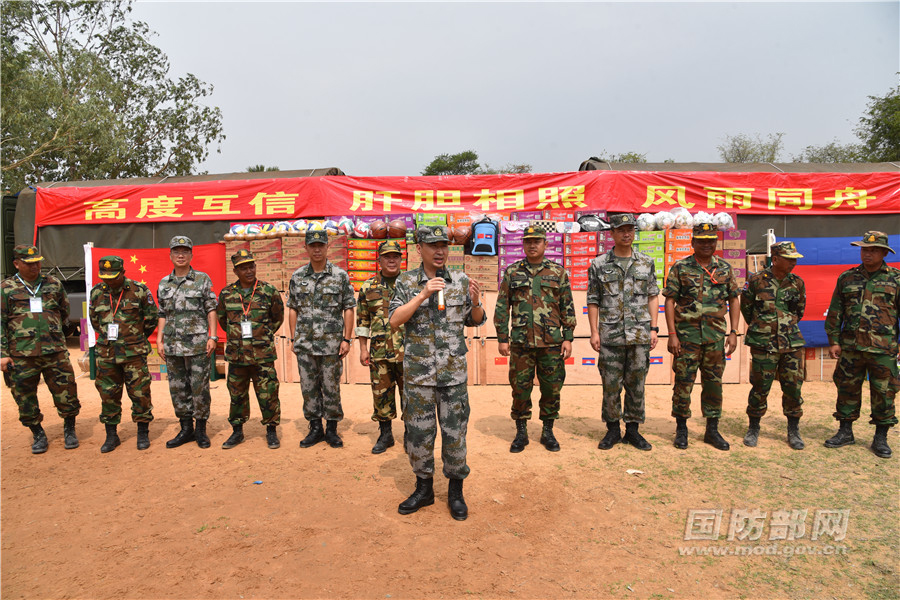 “金龙-2018”中柬人道主义援助活动现场,中方指导组组长张元松大校发表讲话。牛利 摄