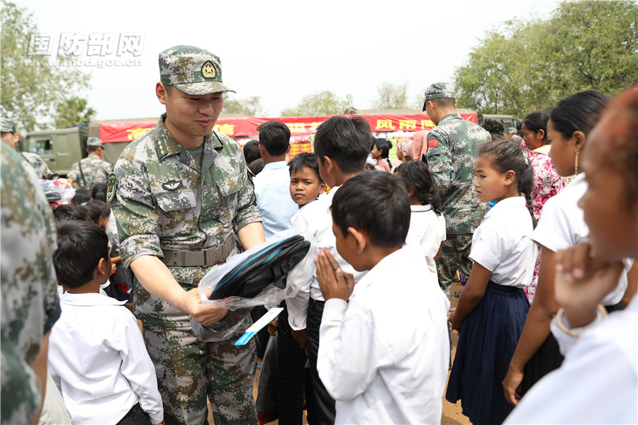 中方官兵给学生赠送书包和文体器材。李源俊 摄