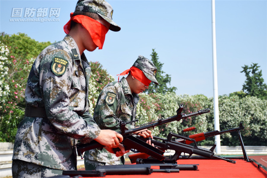 精准熟悉枪械性能,熟练操作武器装备,达到人装结合,是对警卫兵的基本要求。图为警卫兵正在进行无光条件下枪械的分解与结合训练。