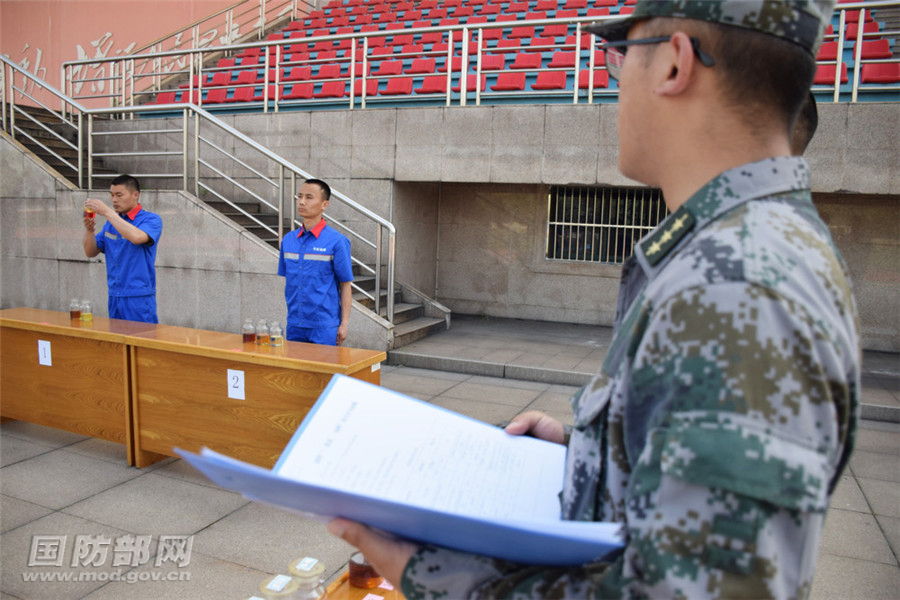 眼睛看一看油品的颜色,鼻子闻一闻油料的气味,就能从几十种油料样本中精准说出该油品的型号和用途。图为油料保管员正在进行油料识别比武训练。