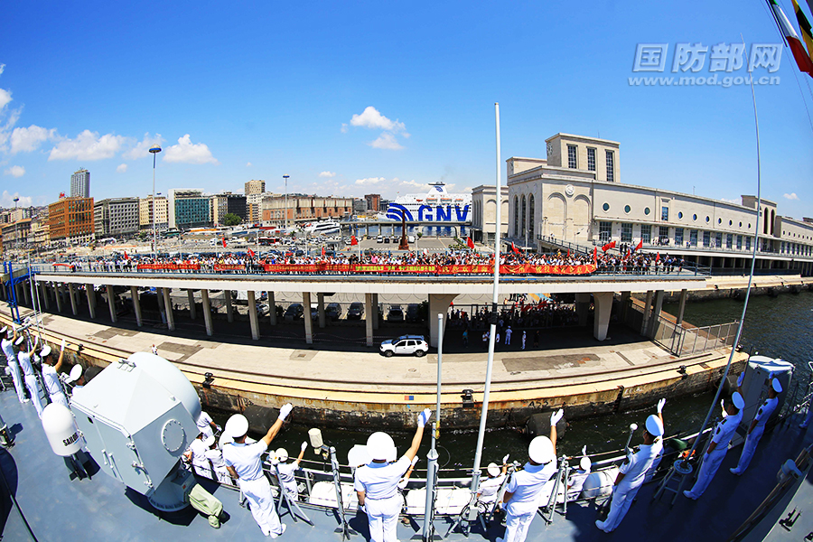 波光粼粼,鸥鸟翔集。12时30分,滨州舰驶入那不勒斯港,官兵在甲板上整齐列队,向欢迎人群挥手致意。中国驻意大利大使李瑞宇携夫人及使领馆工作人员、当地华人华侨代表500余人在码头上挥舞着五星红旗,高举着欢迎横幅迎接滨州舰的到来。