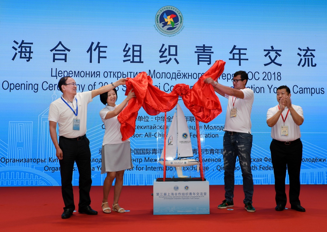 7月16日,在开营仪式上,嘉宾为象征青年友谊的“上合组织青年号”帆船揭幕。李紫恒 摄