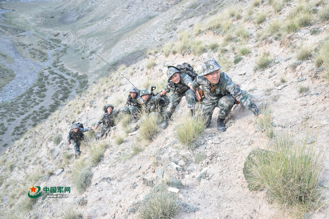 在高达60多度的陡坡上,新战士手拉手,分批次翻越穷铁列克达坂。严晓春摄