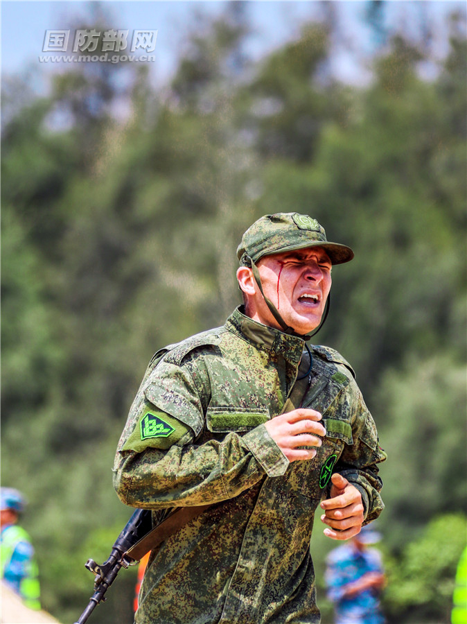 7月30日,海上登陆赛第一阶段障碍赛比赛现场,俄罗斯参赛队员在通过障碍时不慎划伤眼角。障碍赛赛程总长为1200米,设置19个障碍物。交通壕、混凝土墙、铁丝网、斜梯等障碍物布满了整个赛场。在炎热的天气下,眼角受伤,汗水更加重了眼角的不适感。既然受伤不能睁眼,俄罗斯参赛队员索性闭着一只眼,哪怕在汗水的作用下伤口刺痛,他也要跑完剩下的路程。永不言弃!这正是体育精神最大的魅力!