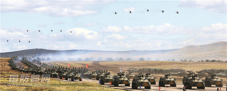 9月11日至13日,参演双方开展了战略级联合战役演练、联合战役指挥演练、实兵实弹演练和沙场检阅。呼啸而过的战机,急速开进的装甲战车,以及发出阵阵怒吼的各型火炮,使人烟稀少的楚戈尔草原弥漫着实战氛围。我军参演部队以过硬的战斗素养、顽强的战斗作风,在异国演兵场、检阅场精彩亮相,展示出中国军队捍卫和平的决心和能力。