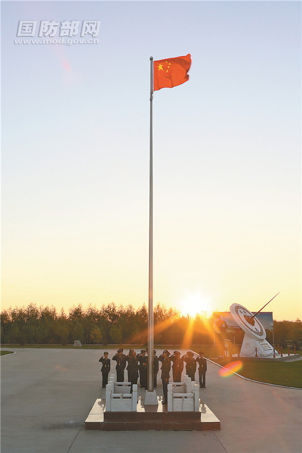 10月1日,驻守黑瞎子岛的北部战区陆军某边防旅东极哨所官兵,迎着第一缕曙光举行升国旗仪式。张剑摄