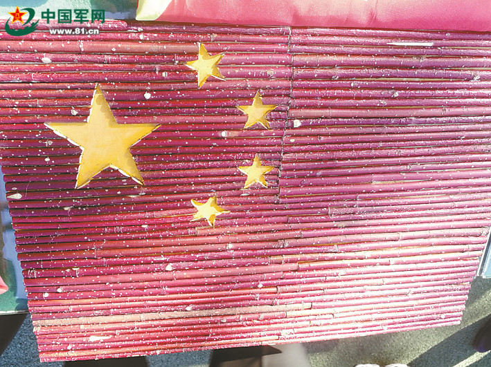 牛耳河边防连官兵用从额尔古纳河畔采集的红柳树枝和白桦树皮制作的国旗。记者 高立英摄