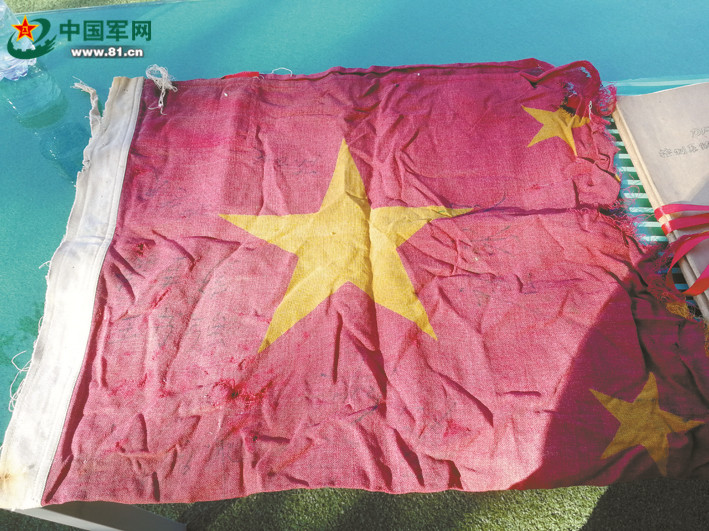 30年前,在南沙渚碧礁上空,首批守礁官兵升起了第一面五星红旗。南沙的风雨和高盐高湿的环境,让这面国旗在不到两个月的时间里就残缺了一半,但上面守礁官兵的签名和誓言依然清晰可见。这面旗也被带到了活动现场。