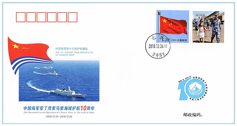 《中国海军亚丁湾索马里海域护航10周年》外宣纪念封第19枚,反映第十九批护航编队护航经典瞬间。