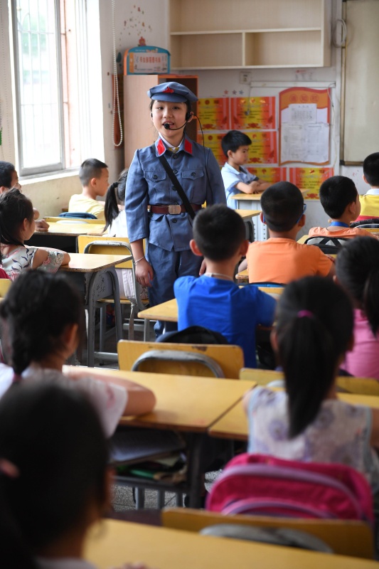 6月12日,在江西于都长征源小学,“红娃讲解员”蔡昀萱在给三年级2班同学讲红色故事。新华社记者 周密 摄
