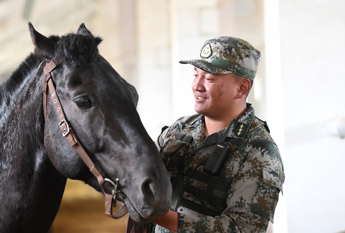 西部战区陆军某旅玉树独立骑兵连连长尼都塔生与“无言的战友”亲切交谈(7月6日摄)。新华社记者 张永进 摄