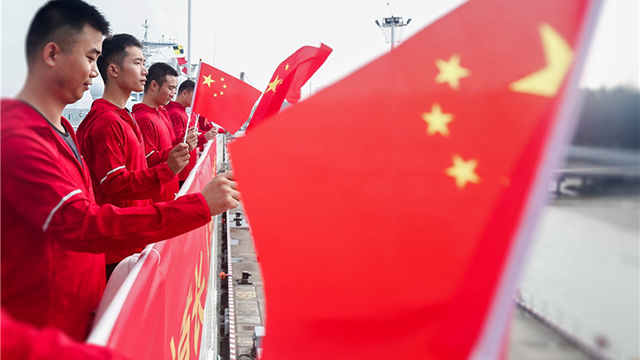 10月12日上午,远望号火箭运输船队驶离中国卫星海上测控部码头,出航执行海上运输任务。